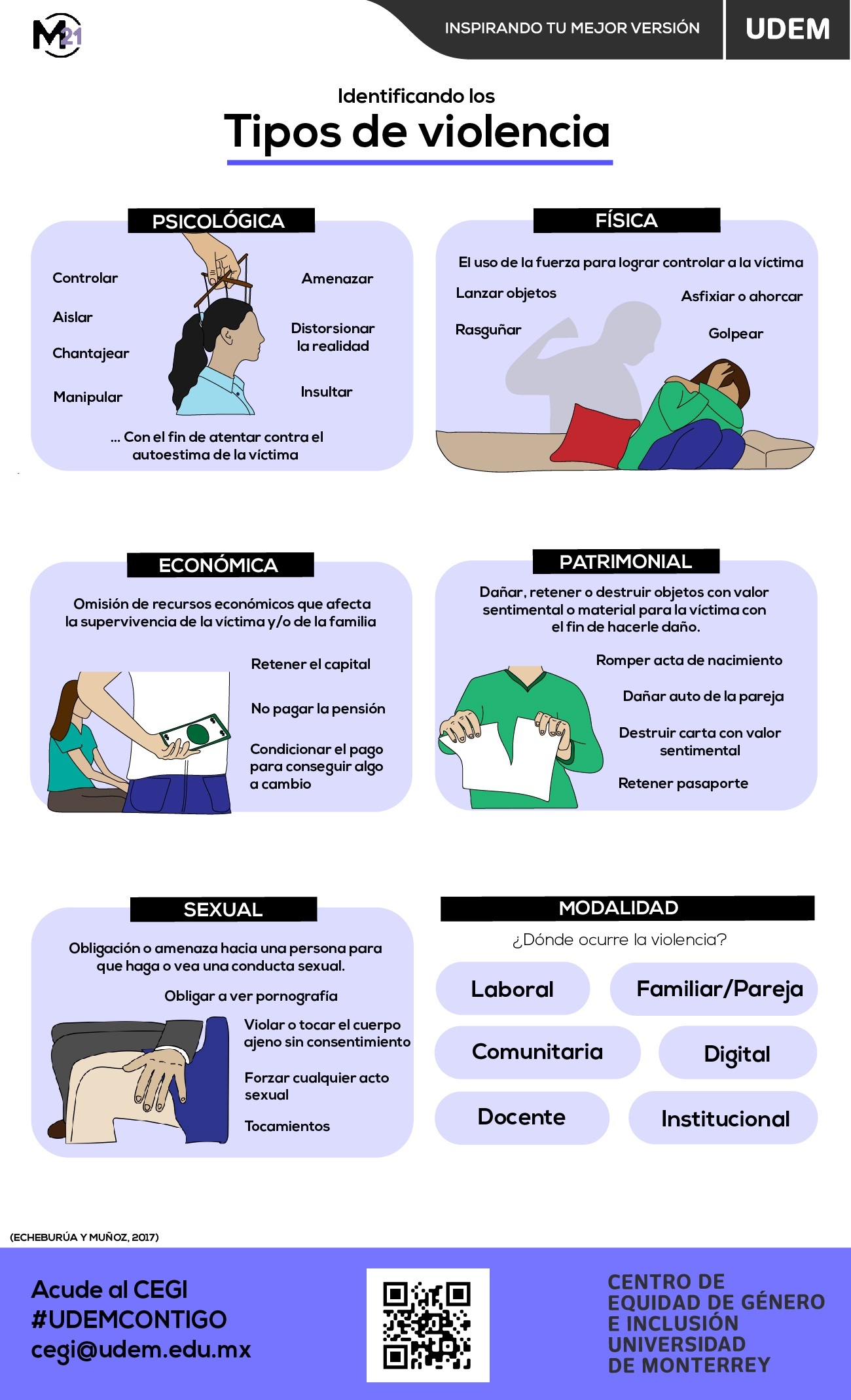 Asimismo, es importante conocer los tipos y formas de violencia, ya que esta no se limita únicamente a la agresión física, sino que también puede presentarse de manera psicológica, económica, sexual, entre otras.